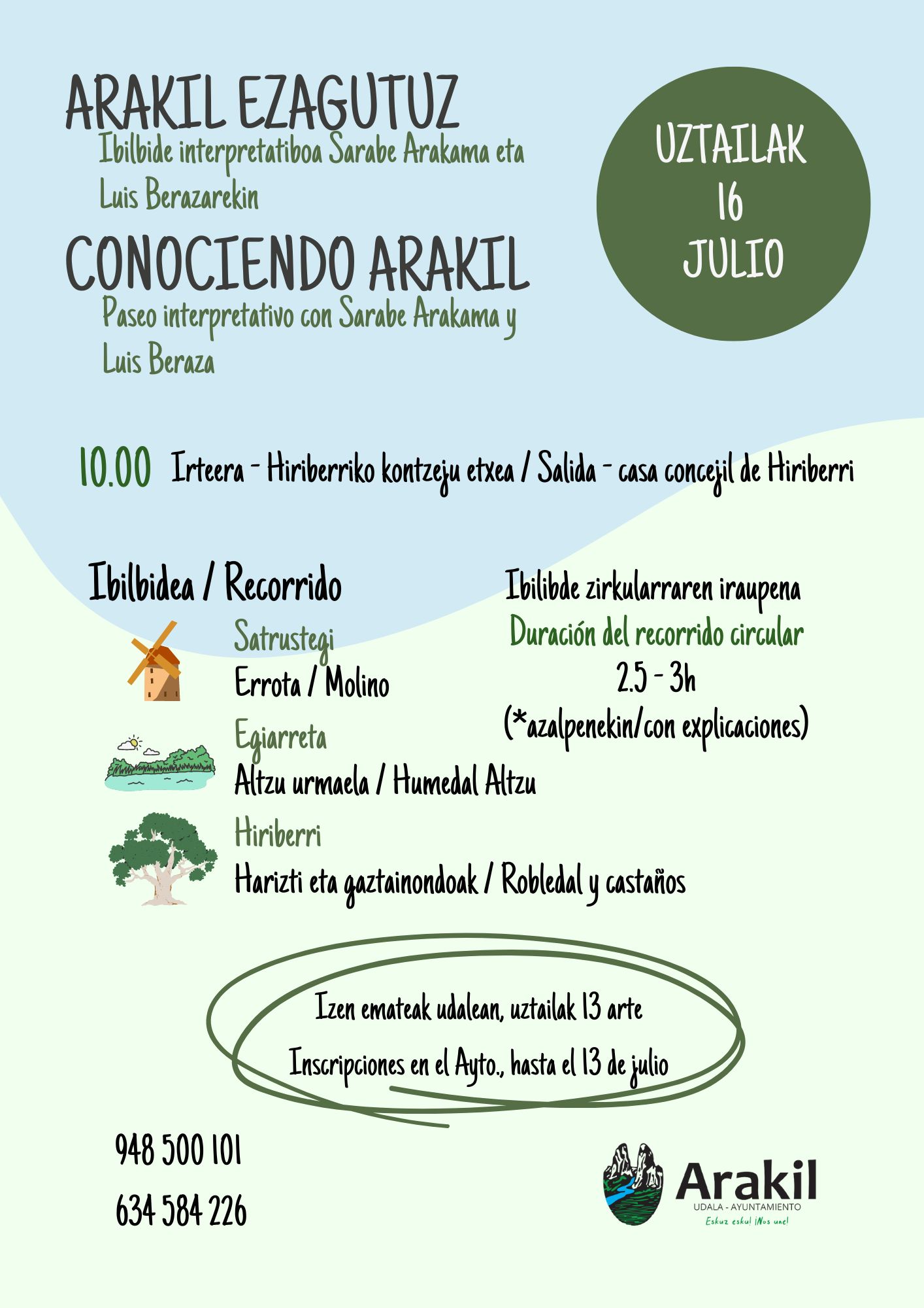 Contaremos con los/as técnicos/as Sarabe Arakama y Luis Beraza en este recorrido que nos llevará a conocer varios rincones de Arakil.