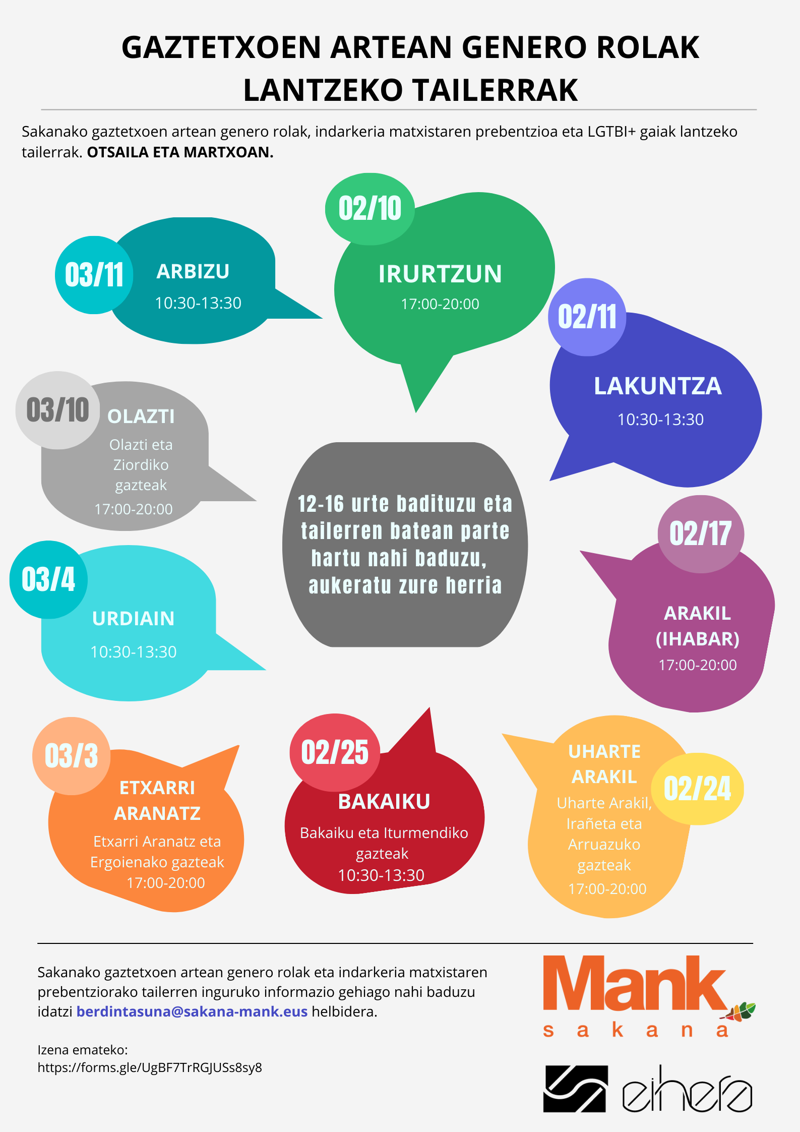 - https://forms.gle/GzaxneYaWTR3LcFp6 o mediante correo electrónico: berdintasuna@sakana-mank.eus