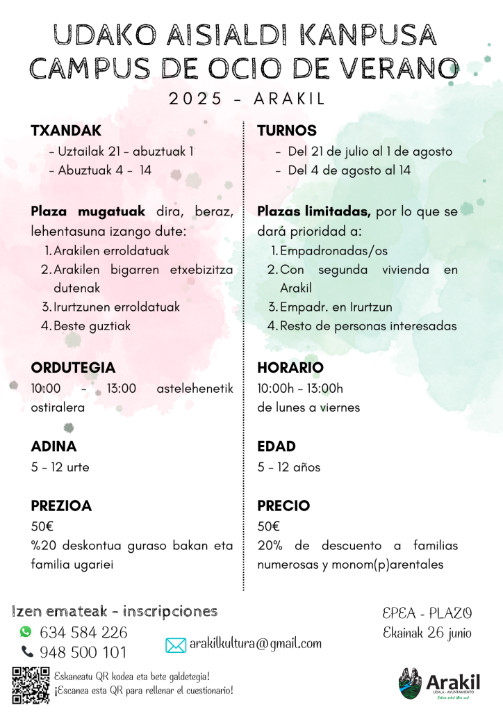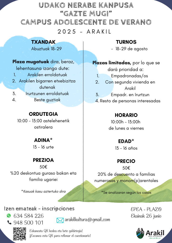 El precio para inscribirse será de 50€ (descuento para familias numerosas y monom(p)arentales presentando documentación) y el plazo para hacerlo finalizará el 26 de junio. Se puede rellenar el cuestionario de inscripción en el siguiente enlace (https://forms.gle/cjrscXo3Xq6cRwjt6), ponerse en contacto a través de los teléfonos 634 584 226 / 948 500 101 o escribir a arakilkultura@gmail.com.