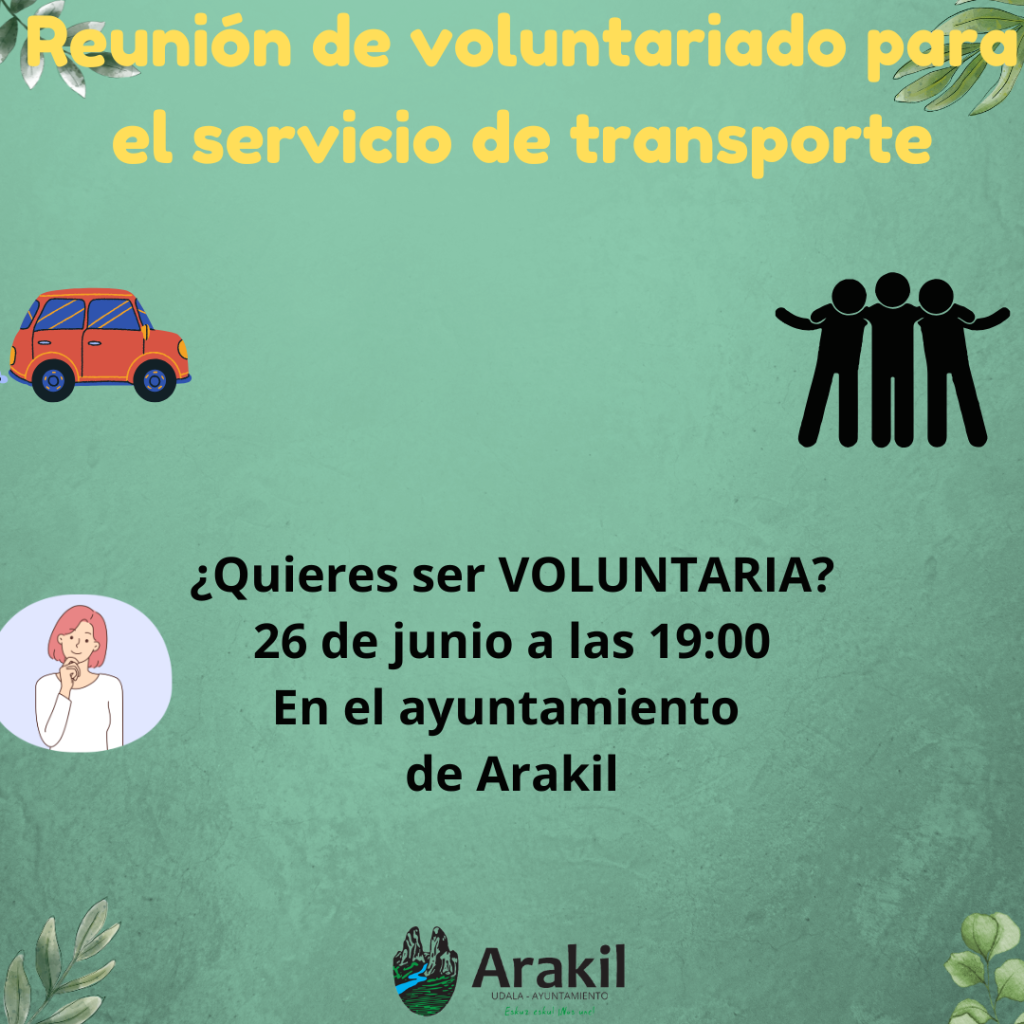 El próximo jueves 26 a las 19:00 en el ayuntamiento de Arakil celebraremos una reunión abierta a toda persona interesada en ser voluntaria en el proyecto que tenemos para abordar la problemática del transporte.
